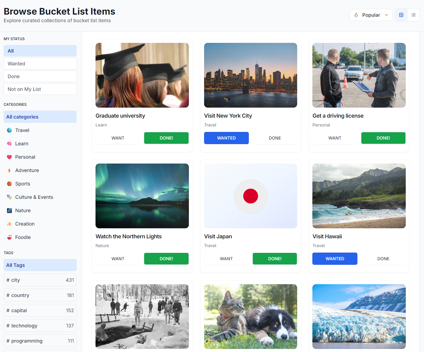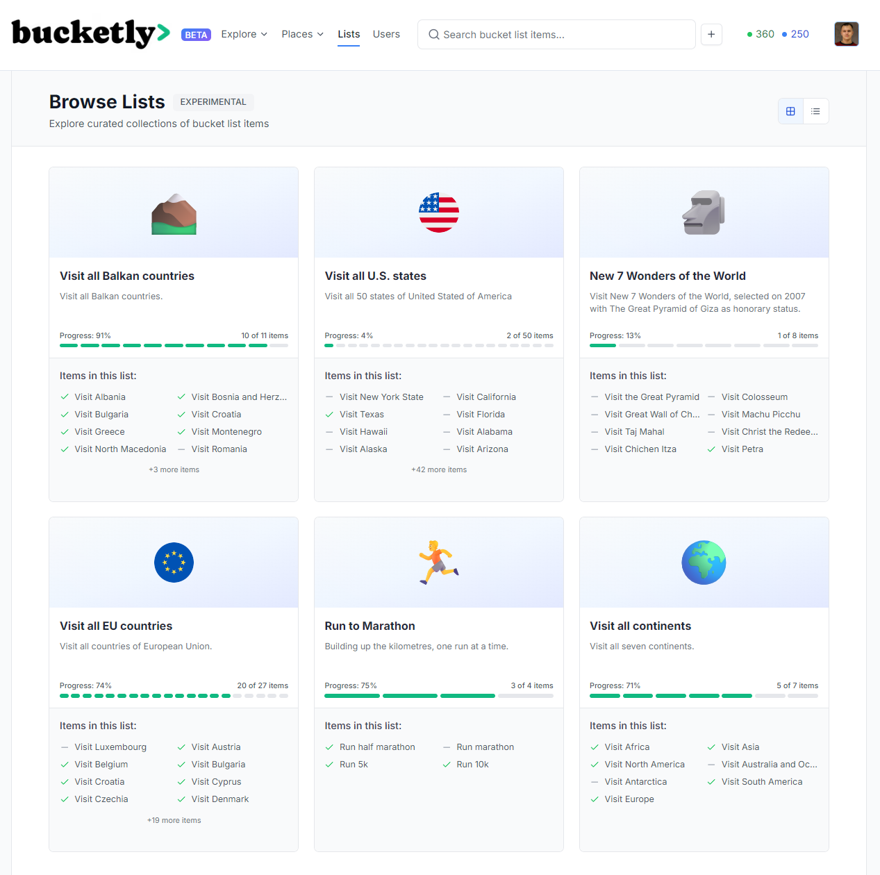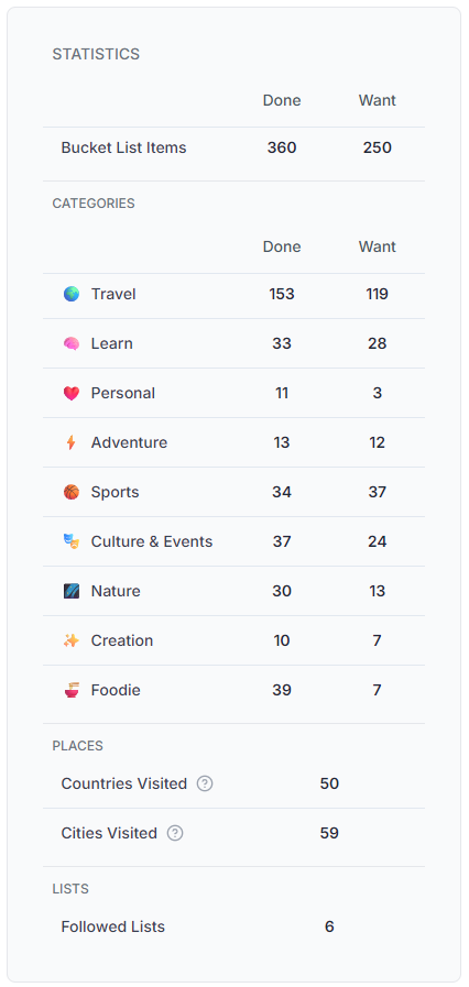 We've also been busy behind the scenes, conducting quality checks on bucket items and refining categories and tags to ensure our data is as useful as possible. Our experimental "Lists" feature is off to a great start with 5 new items already added. With your positive feedback, you can expect hundreds more to come!