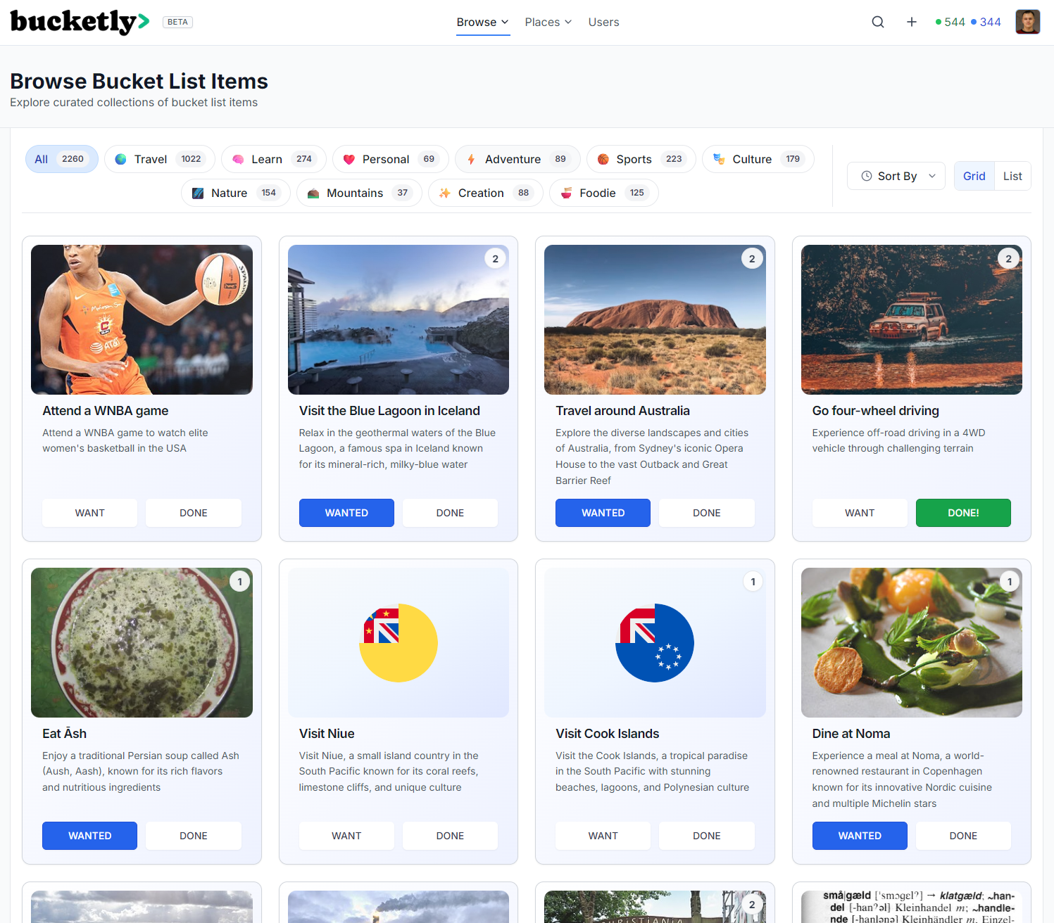 It currently includes 89 items and is growing. If you wish, you can also browse each country's bucket list. Just click on Places in the header: