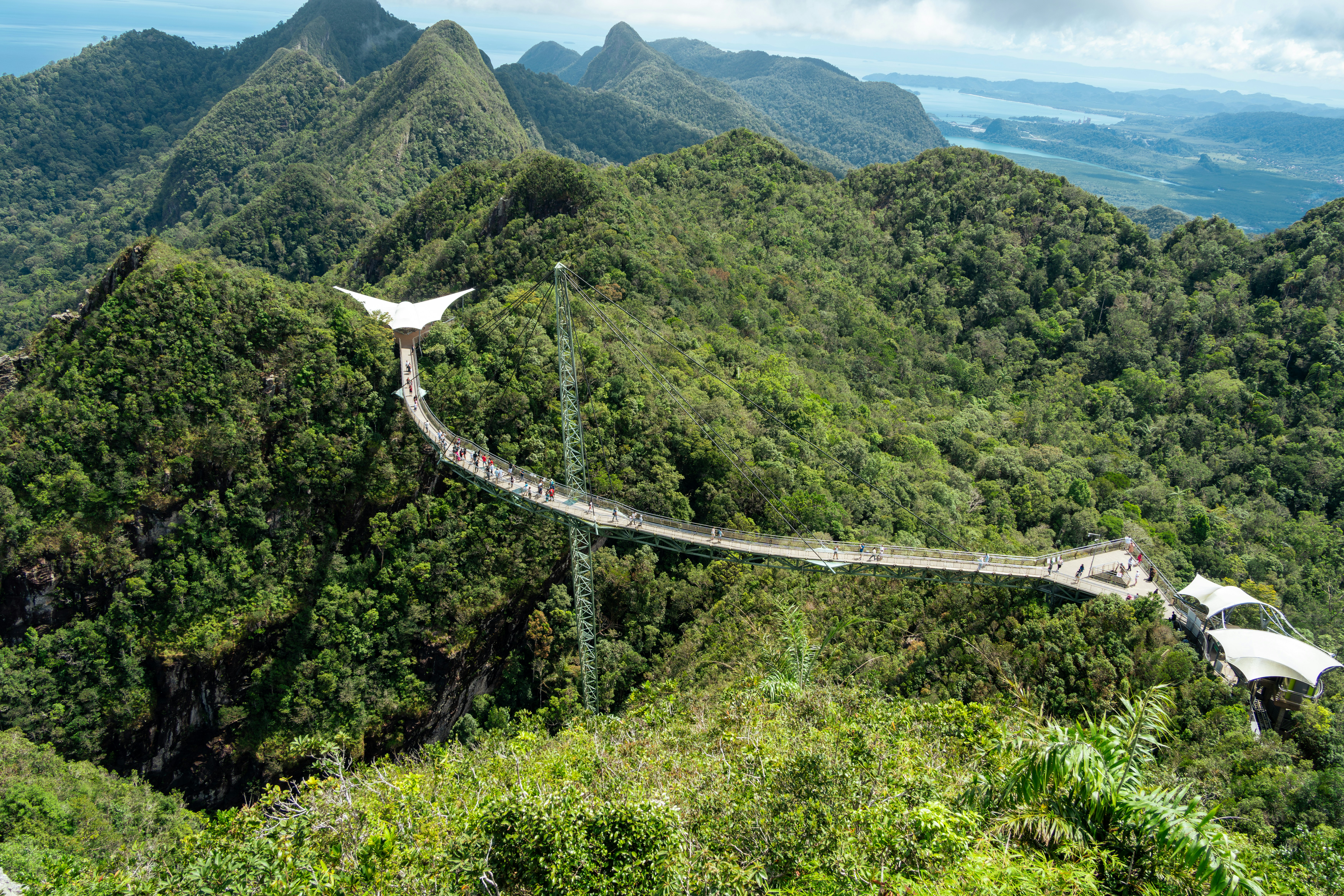 Walk on the Langkawi Sky Bridge, a curved pedestrian bridge suspended 100 meters above the ground in Malaysia.
